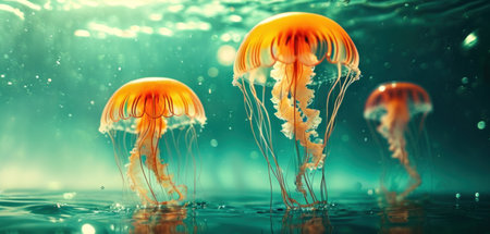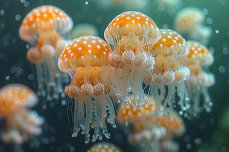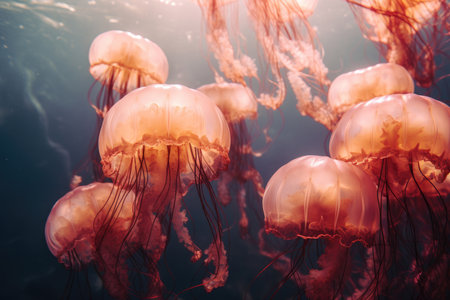Magnificent marine life: a tranquil swarm of majestic jellyfish floating serenely underwater in the golden glow of the ocean.