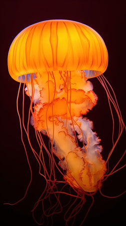 A vibrant orange jellyfish gracefully floating in a calm, dark ocean, showcasing its delicate tentacles and translucent bell.