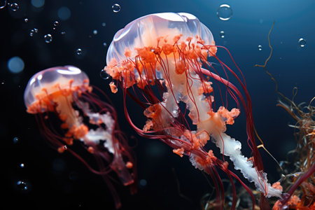 Orange and white jellyfish gliding gracefully through the dark depths of the ocean, showcasing long, flowing tentacles in serene beauty