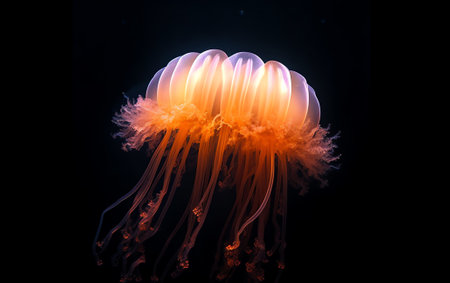 Vibrant jellyfish floats gracefully against a dark ocean backdrop, displaying its bioluminescent beauty