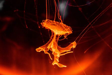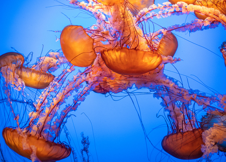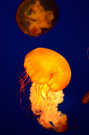 Orange jellyfish in an aquarium with blue water background