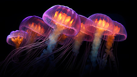 Group of rare colored jellyfish close-up, dark background. AI generated. Marine ocean fauna, wildlife. Header banner mockup with copy space.