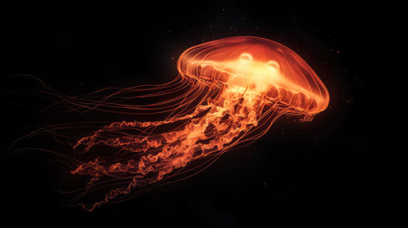 Luminous orange and purple jellyfish with long tentacles is gracefully swimming in dark water