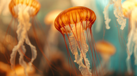 Jellyfish move gracefully through the water displaying vibrant colors and intricate tentacles in their natural ocean habitat.