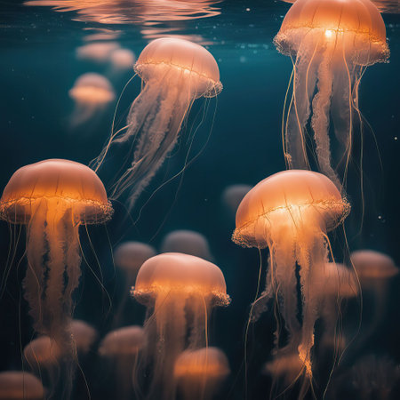 Glowing jellyfish are captured in a serene dance, their delicate tentacles trailing in the twilight-hued underwater ambiance.