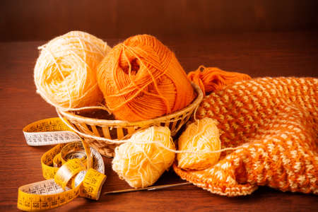 Ball of woolen thread for knitting orange color and knitting needles