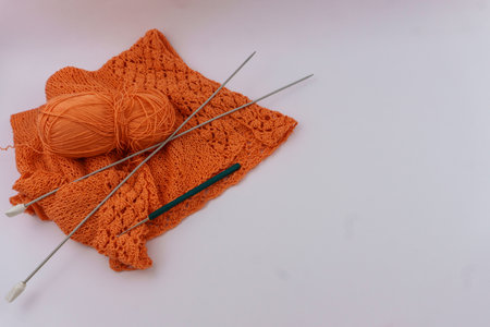 Orange cotton knit fabric with yarn, knitting needles, and crochet hook on a light background, flat lay view with copy space. Ideal for tutorials, social media posts, and promotional materials.