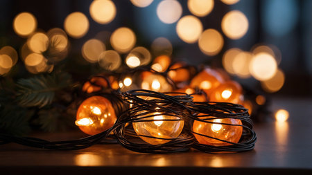 The image showcases warmly lit, artistic string lights, arranged in a circular pattern, creating a cozy and festive ambiance on a wooden table, perfect for holiday decorations or intimate gatherings. AI generated image