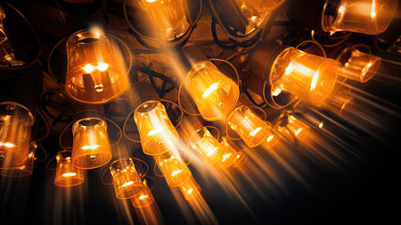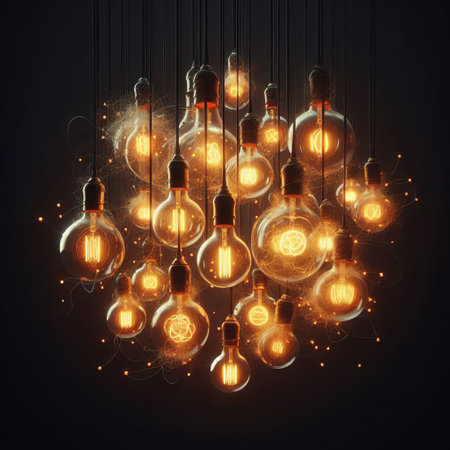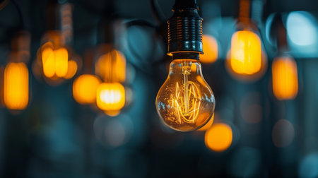 A dynamic cluster of glowing Edison bulbs hanging, casting a warm light with visible filaments, suitable for mood lighting.. AI Generation