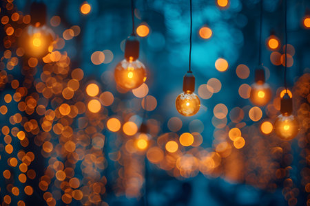 Softly glowing, hanging vintage-style light bulbs illuminate a magical festive scene. warm bokeh lights in the background create a beautiful and cozy winter wonderland atmosphere, perfect for holiday celebrations, festive decorations, and seasonal displays. Generative AI