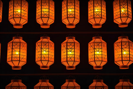 Glowing orange lanterns creating warm decorative background, Vertical hanging lanterns forming ambient light pattern