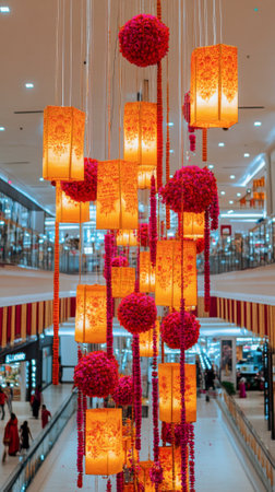 Elegant Interior Decor in Shopping Mall with Orange Lanterns and Pink Floral Arrangements. Concept of Modern Design, Festive Atmosphere, Creative Lighting. Vertical.