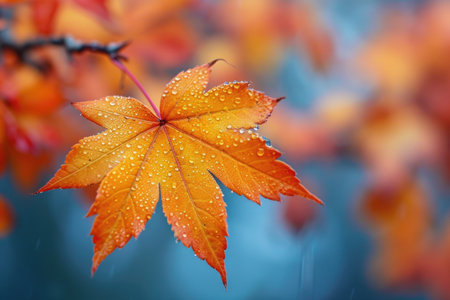 Autumn leaves with water drops on blue bokeh background.