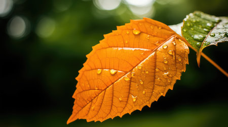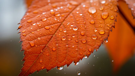 Explore the beauty of dewy orange leaves captured in stunning detail. Water droplets glisten on vibrant foliage, showcasing nature's elegance in autumn.