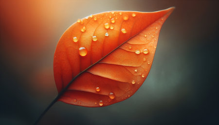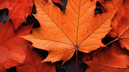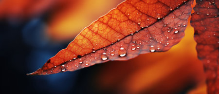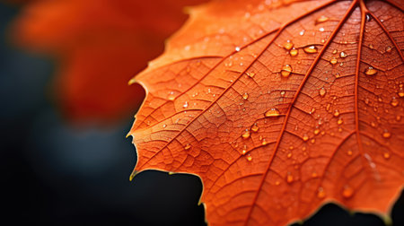 Close-up nano photo of an autumn leaf, highlighting intricate veins and water droplets. Vivid orange leaves in macro detail.