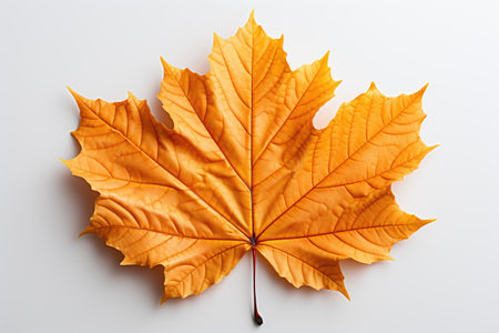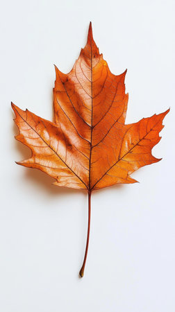 A stunning orange maple leaf rests on a white surface, highlighting its intricate details and crisp textures that embody the essence of autumn.