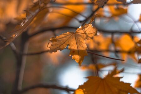 Beautiful autumn scene with orange leaves and blurred brown branches, great design for social media, seasonal quotes. Vintage fall wallpaper. Natural garden landscape background.