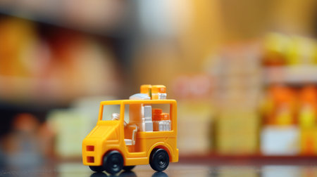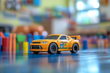 A yellow toy sports car with racing decals on a glossy surface, surrounded by colorful blurred toys in the background. High quality photo