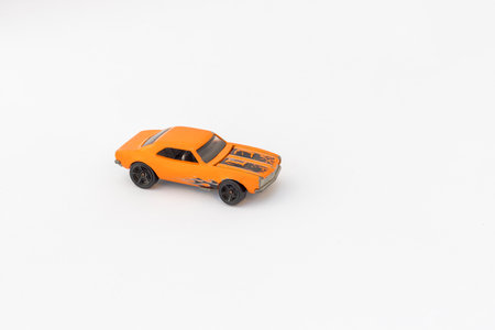 Vintage Orange Toy Car with Racing Stripes on White Background