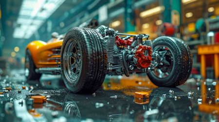 Close-up of the wheel and suspension mechanism of a racing car in the workshop garage.