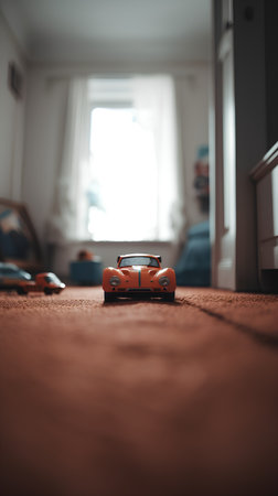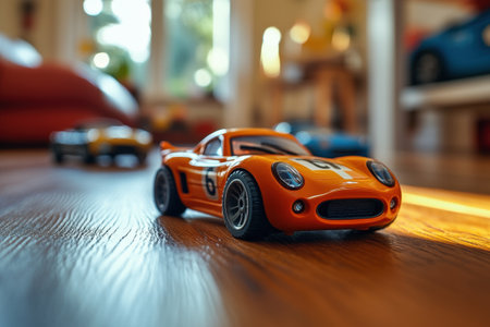 A vibrant orange toy race car with racing number six is positioned on a wooden floor. Sunlight fills the cozy room, highlighting other scattered toy cars and a warm, inviting atmosphere, perfect for imaginative playtime.