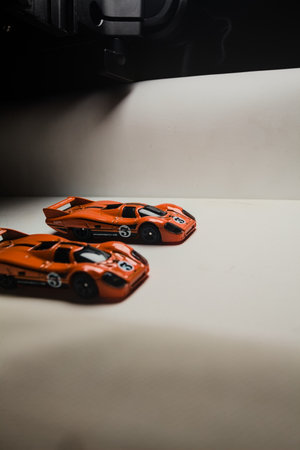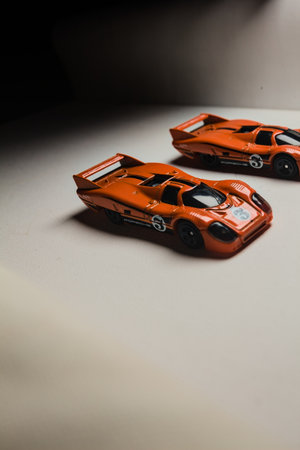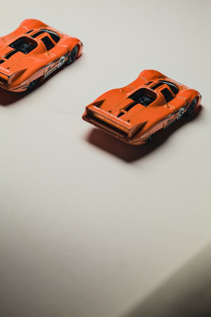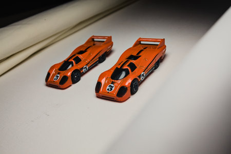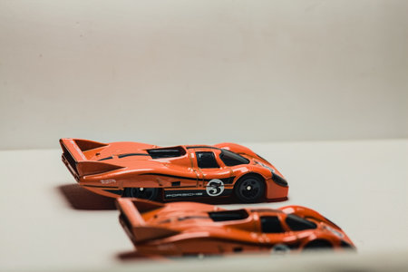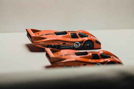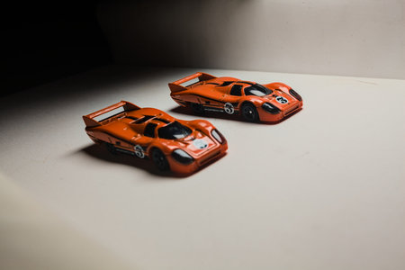 Mantua, Italy - 28TH DECEMBER 2025 - Hot Wheels replicas of two Porsche 917C in orange race livery pretending to have a race on a race track