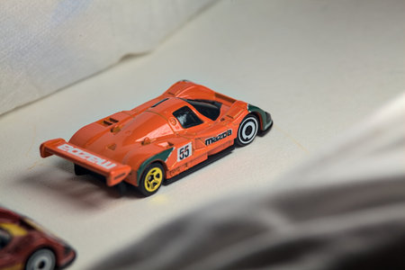 Mantua, Italy - 4TH JANUARY 2025 - Hot Wheels replicas of two Mazda 787B in race livery on white board, bordered by white rolls of fabric, pretending to make a curve on a road and having a race between them