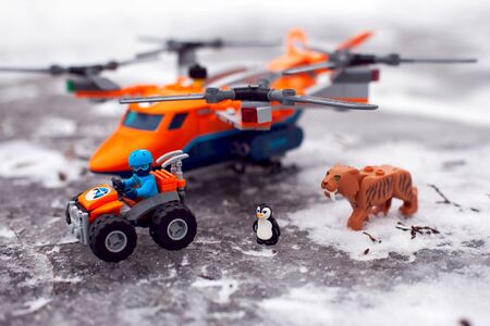 Tambov, Russian Federation - January 28, 2020 Lego all-terrain vehicle with explorer, saber-toothed tiger, penguin and heavy-duty quadrocopter with 4 spinning rotors on ice surface outdoors.