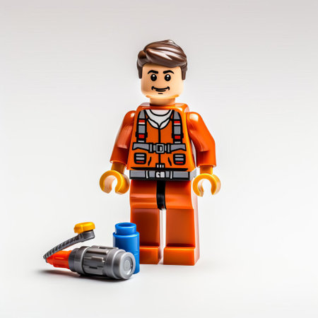 the plumber, meticulously crafted from lego bricks, stands proudly on a pristine white isolated background, showcasing his bright yellow hard hat, blue overalls, and trusty tool belt, evoking a sense of nostalgia and creativity in fans of the iconic toy bricks and construction playsets. ai generated