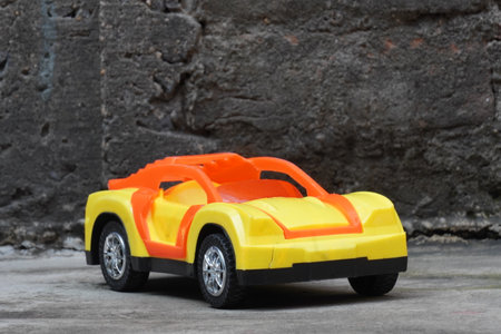Close up of yellow toy car on grey concrete background with copy space