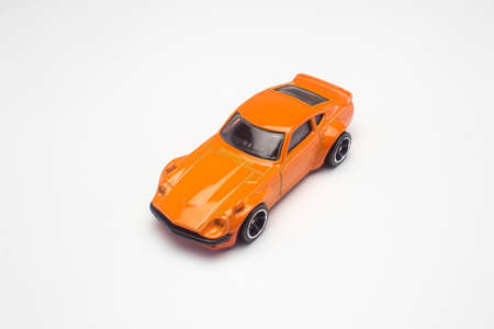 08 November 2020 Ukraine, Zaporizhzhya. Orange model of toy car on a yellow background with place for text. Banner for toy store toy typewriter cars.