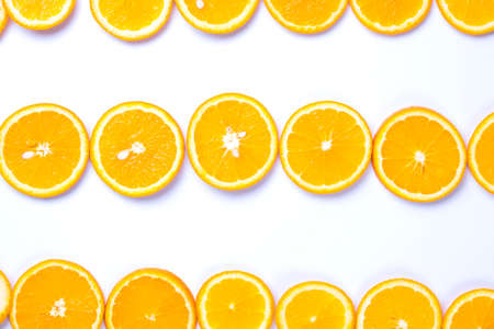 line of fresh sliced oranges on white background