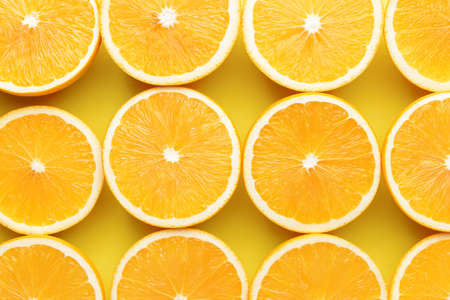 A visually appealing arrangement of freshly cut orange slices on a cheerful yellow background, showcasing vibrant colors, textures, and the essence of healthy eating.