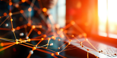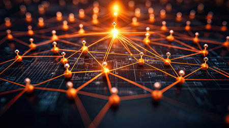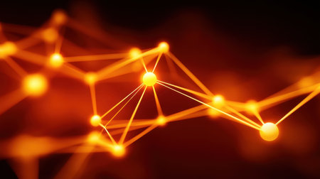 This vibrant abstract image features glowing orange nodes interconnected by lines, representing technology and data flow in a modern digital environment.