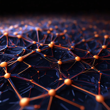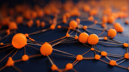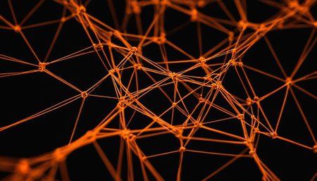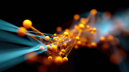 Abstract Representation of Network Connections and Data with Orange Nodes on a Dark Background.