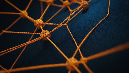 Abstract representation of interconnected network nodes with orange connectors on a textured surface, symbolizing digital communication and connectivity in technological infrastructure. Generative AI