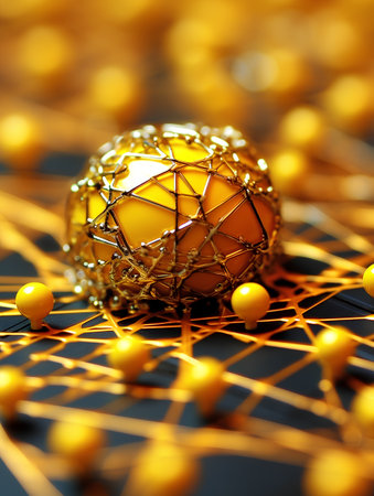 An abstract digital artwork featuring a golden network of smooth geometric shapes and bright points of light, evoking a sense of connection and modernity.