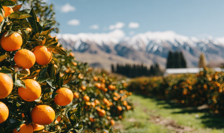 An orchard showcases a vibrant display of orange fruit hanging from trees. The image captures the fruit's color and the textures of the foliage. The scene is bathed in sunlight, with a mountain range providing a blurred background. Suitable for various commercial applications related to agriculture and nature.