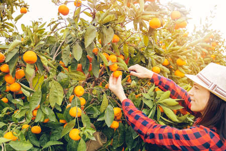 Farmer woman harvesting tangerines in an mandarin tree field