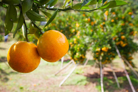 2 fresh oranges Beautiful glossy skin Waiting for the farmers to harvest in the orange groves on the foothills Which is a combination of organic farming Reduce the use of chemicals.