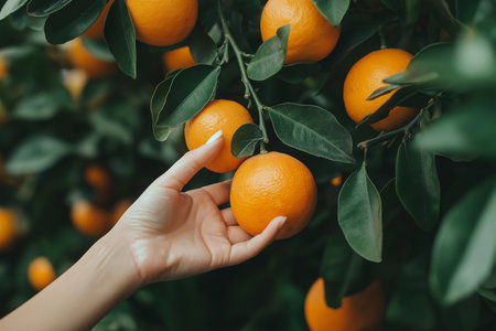 Hand delicately plucks a ripe clementine mandarin from a tree laden with vibrant orange fruits, capturing the essence of harvest and freshness.