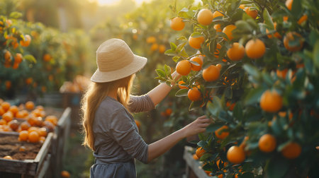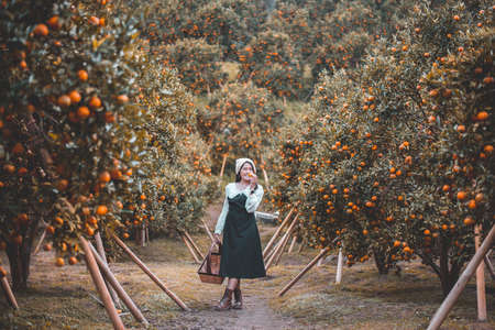 Caucasian farmer woman picks oranges on the orange tree in the garden.