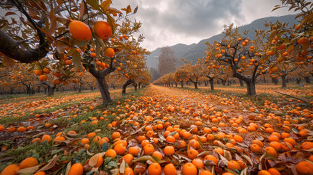 This stunning image captures a vibrant orange orchard with fallen fruits scattered on the ground. The scene features trees under a cloudy sky, representing the autumn harvest season.