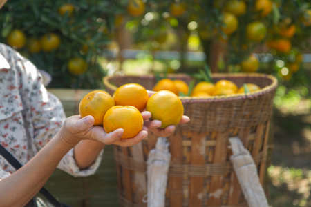 Woman 's hand holding orange mandarins in her hands in orange garden. image