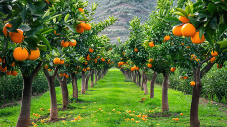 Discover a vibrant orange orchard filled with ripe fruits, lush greenery, and a tranquil pathway. This image captures the essence of agricultural beauty and seasonal abundance.