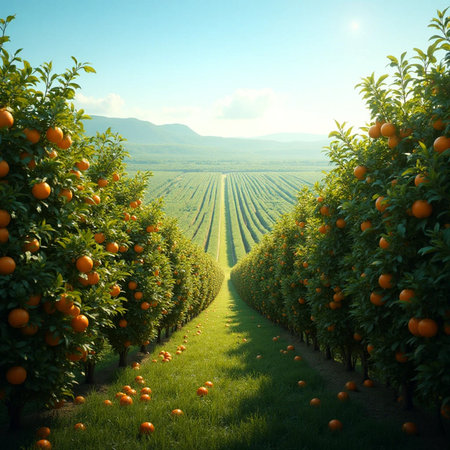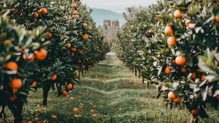 Well-organized orange orchard with rows of trees filled with ripe fruit, showcasing the abundance of the harvest.