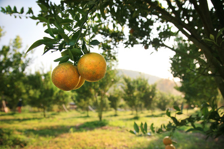 Ripe mandarin tree growing in the farm garden.