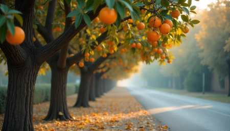 Orange tree avenue on autumn road, hazy morning light