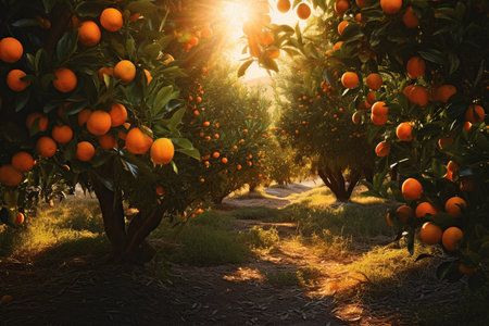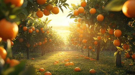 A beautiful orange grove illuminated by golden morning sun, showcasing vibrant trees full of ripe fruit. This peaceful scene highlights nature's bounty and tranquility.