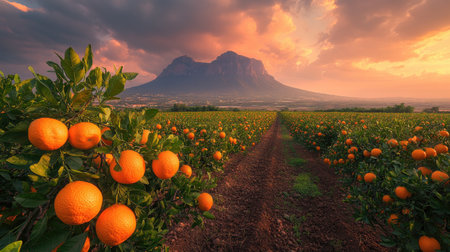 An orange orchard with mountains in the background at sunset, showcasing an abundance of oranges on the trees and hillsides. The focus is centered around a field full of vibrant tangerine fruit, creating a picturesque scene of nature's beauty. In front of it lies dirt fields covered by rows upon rows of green leaves that frame each blossoming orange tree branch. A majestic mountain range looms behind them under a dramatic sky painted in hues of pink to grey. --chaos 50 --ar 16:9 --stylize 500 --v 6.1 Job ID: 2dd99428-278a-4fa4-8510-6a05bfa8467c